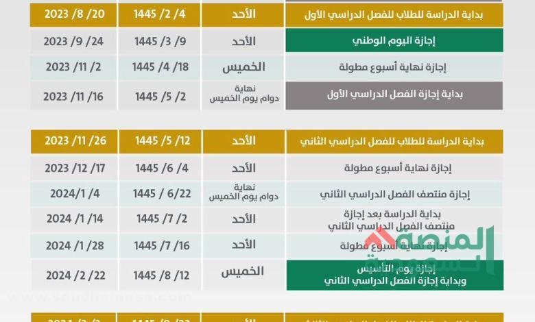 يتم ترتيب التقويم الدراسي في عام 1445- عام 2024 م، وقد تقرر أن يتكون من ثلاثة فصول دراسية، بالإضافة إلى الإجازات المدرسية وعطلة الجمعة والسبت، كما يتضمن كل فصل عددًا من الإجازات الممتدة، فيما يلي تفاصيل التقويم الدراسي 1445 – 2024 كالتالي: –